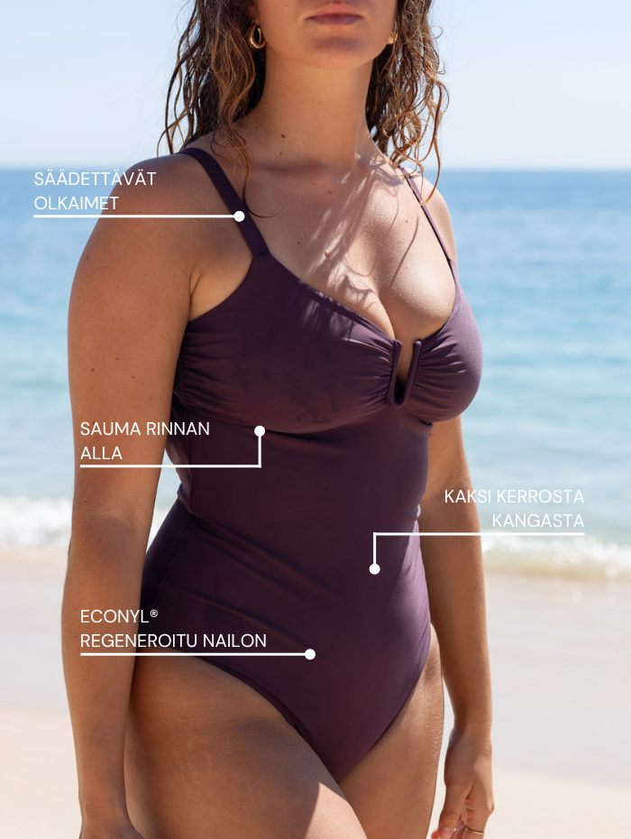Arc Onepiece -uimapuvussamme yhdistyvät elegantit ja säädettävät yksityiskohdat. Uimapuvussa on solmittava selkäpuoli ja sen säädettävien olkaimien avulla pystyt vaikuttamaan uimapuvun istuvuuteen ja pituuteen. Olemme myös lisänneet sauman rinnan alapuolelle, jotta uimapuku myötäilee muotojasi vielä paremmin. Uimapuvussa on keskipeittävä alaosan leikkaus, ja lisäksi reunojen saumaton viimeistely takaa yleellisen tuntuman.