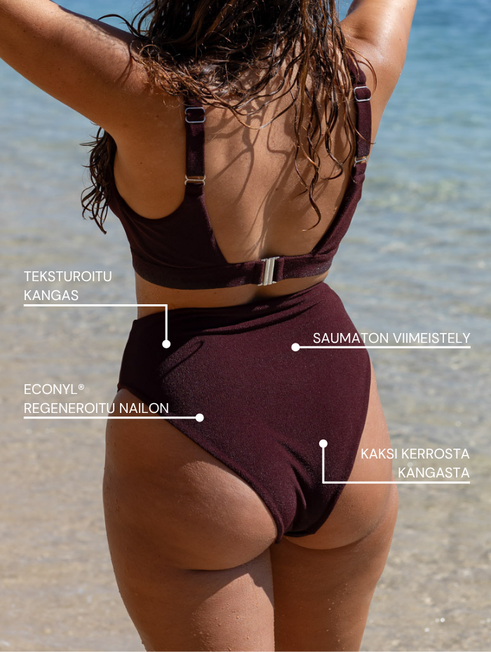 Alaosan saumaton viimeistely sekä kaksinkertainen kangas takaavat mukavan ja tukevan istuvuuden sekä vedessä että altaan reunalla. Tuotteen ulkokerros on valmistettu terrymäisestä teksturoidusta kankaasta, joka on erittäin pehmeää ja miellyttävän joustavaa pitäen mukavuutesi aina etusijalla. Tuotteen sisäpuoli on vuorattu yksivärisellä vaalean terrakotan sävyisellä kankaalla.