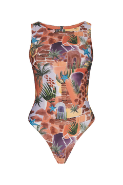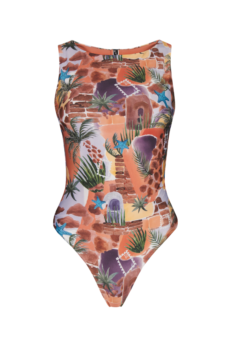 Olemme vuoranneet tämän uimapuvun kaksinkertaisella kankaalla lisätäksemme tukea ja peittävyyttä mukavuudesta tinkimättä, ja reunojen saumaton viimeistely takaa yleellisen tuntuman. Uimapuku on täysin käännettävä: ulkopuolen kangasta koristaa upea vintage postikorteista inspiroitunut Souvenir -printtimme, ja kääntöpuolelta paljastuu kaunis hillitympi terrakotan sävy. Printti on aseteltu jokaiseen tuotteeseen yksilöllisesti, joten ei ole olemassa kahta täysin samanlaista kappaletta.
