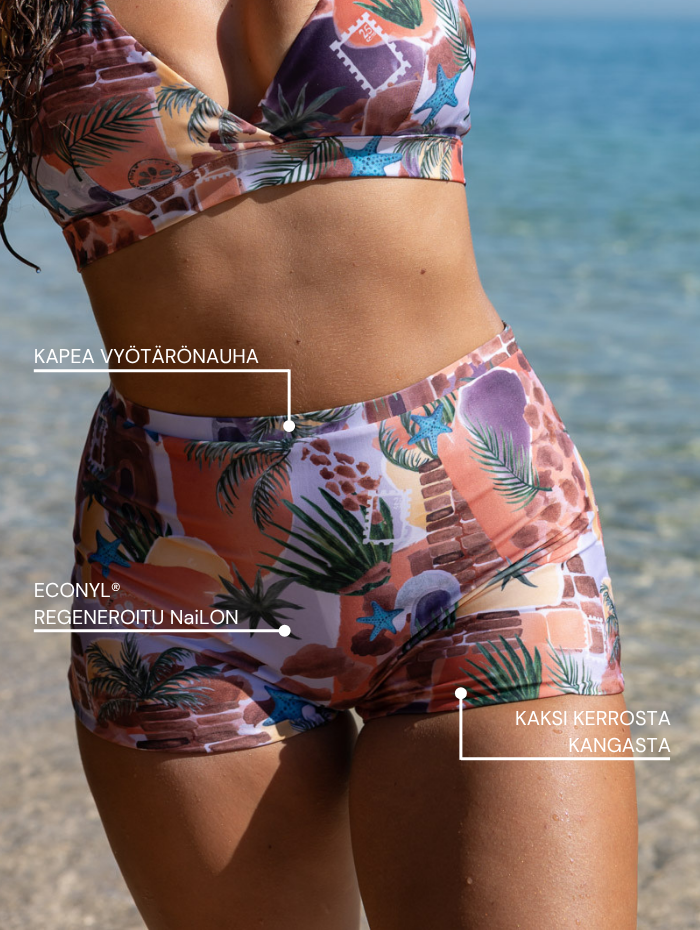 Mini Shortsimme ovat suunniteltu mukavuus ja istuvuus edellä. Niissä on keskikorkea vyötärö ja kapea vyötärönauha. Malli tarjoaa täyden peittävyyden, mutta asettelemalla shortsien vyötärön korkeutta voit säädellä niiden peittävyyttä oman tyylisi mukaan. Shortsit ovat saumattomat edestä ja niiden ainoa sauma takapuolella muotoilee istuvuutta luonnollisesti.