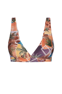 Tämä bikiniyläosa ei ole topattu, mutta mukavuuden takaamiseksi olemme vuoranneet bikiniyläosan kaksinkertaisella kankaalla lisätäksemme tukea ja peittävyyttä. Tuotteen sisäpuoli on vuorattu yksivärisellä vaalean terrakotan sävyisellä kankaalla. Printti on aseteltu jokaiseen tuotteeseen yksilöllisesti, joten ei ole olemassa kahta täysin samanlaista kappaletta.