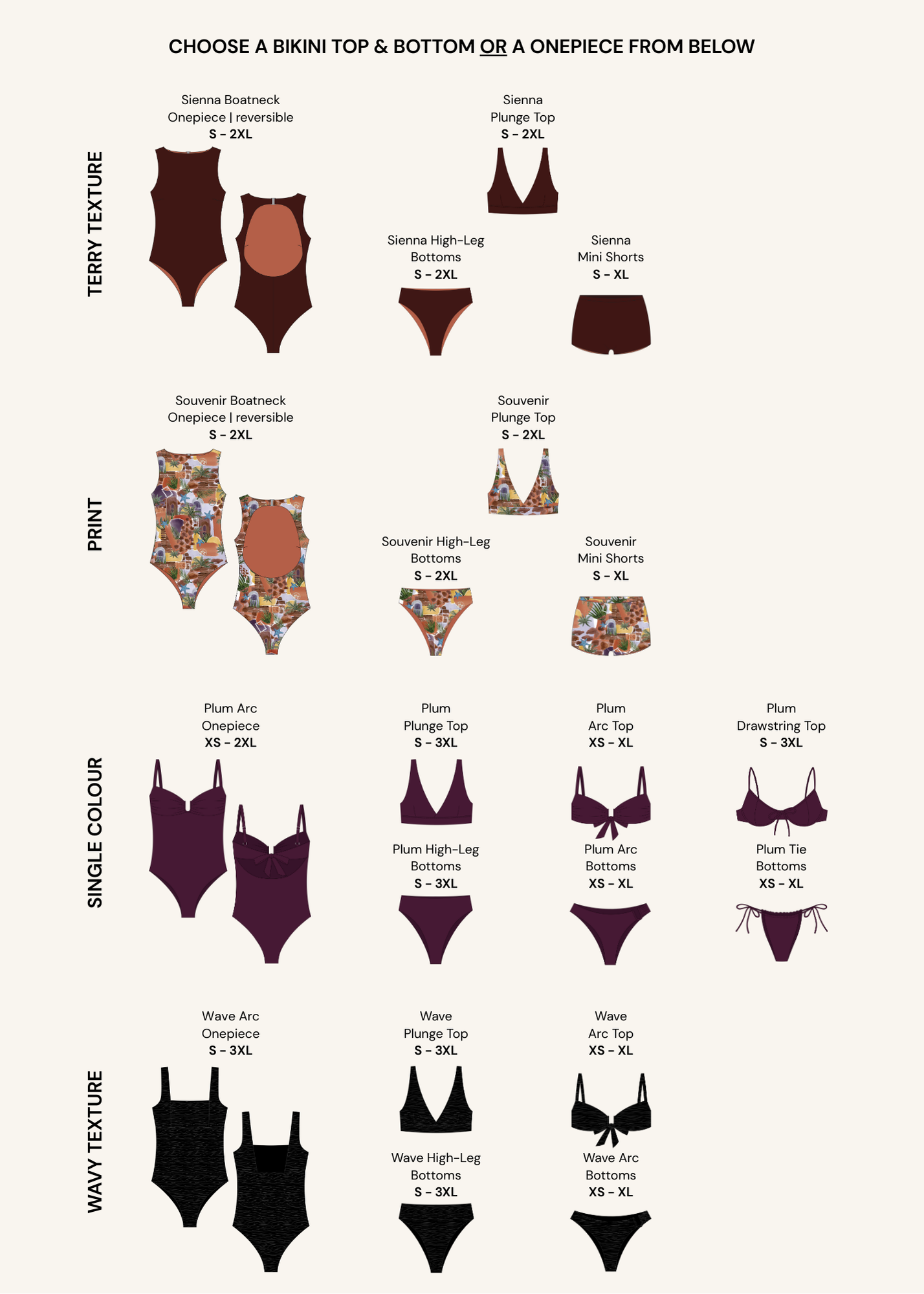 You may choose a bikini top and a bottom, or a onepiece. Feel free to mix and match with the bikini options to find your preferred set!