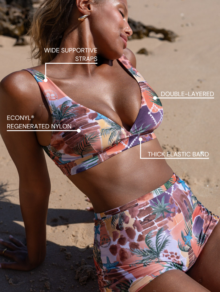 While this top isn't padded, we've gone the extra mile to ensure your comfort. It's double-lined, providing both coverage and support where needed. The inside of the product is lined with solid colour with muted hues of terracotta. Each piece features a unique print placement, ensuring no two are alike.